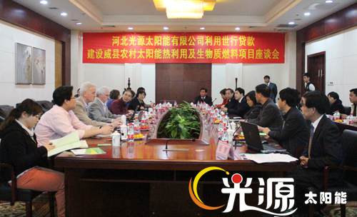識別團一行在河北省發改委外資處副處長史海峰、河北省財政廳涉外處副處長何貴滿、河北省新能源技術推廣站副主任王香雪及市直有關部門負責人的陪同下實地考察了光源公司威縣農村太陽能熱利用及生物質燃料項目。通過考察了解了太陽能采暖、太陽能熱開水系統的工作原理、項目周邊環境及使用情況,并對項目的具體情況展開了座談討論。光源公司副總經理邵東坤就光源公司的基本概況、經營情況以及世行貸款項目概況向識別團進行了匯報,識別團針對項目的建設內容、開發潛力、市場風險等問題進行了提問和討論。