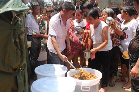 飲食制作小組除了保障本公司員工就餐外,還要做好災民飲食保障工作。送飯小組除了完成送飯任務外,還要幫助飲事小組工作,確保既不誤災民吃飯,又不誤員工用餐。