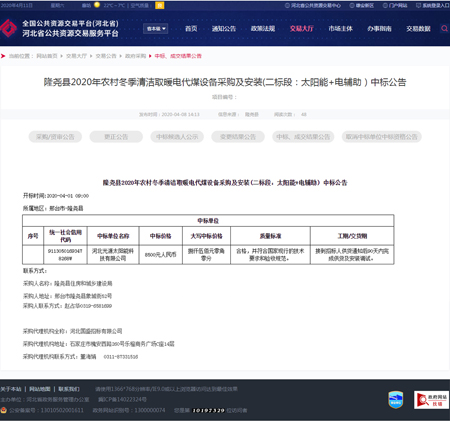 河北光源太陽能科技有限公司憑借完善細致的服務成功中標隆堯縣2020年農村冬季清潔取暖電代煤設備采購及安裝(二標段:太陽能+電輔助)。中標喜訊紛至沓來,彰顯了本公司專業的施工實力與良好的市場口碑。